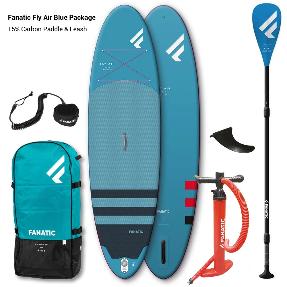 Fanatic Fly Air Paddle Boards 2023… Here at H20 Sports we love them! Two colours, three sizes in the round nose shape (Two in the Touring Models – see the Ray Air) The Fanatic Fly Air inflatable Paddle Board is the perfect all round family board designed to take you from your first paddle to everything thereafter. The construction is top notch using their proven Drop Stitch Light technology incorporating a V-Drop stitch core, with a double PVC layer on the rail providing a stable, sturdy rigid feeling board that is very light weight to handle on and off the water and very, very competitively priced…