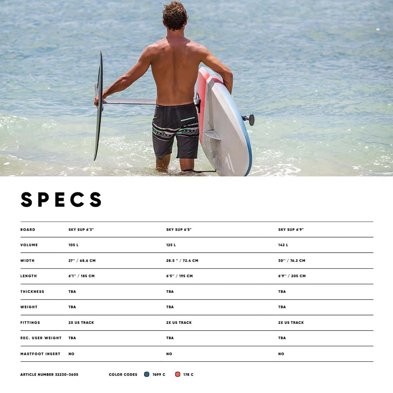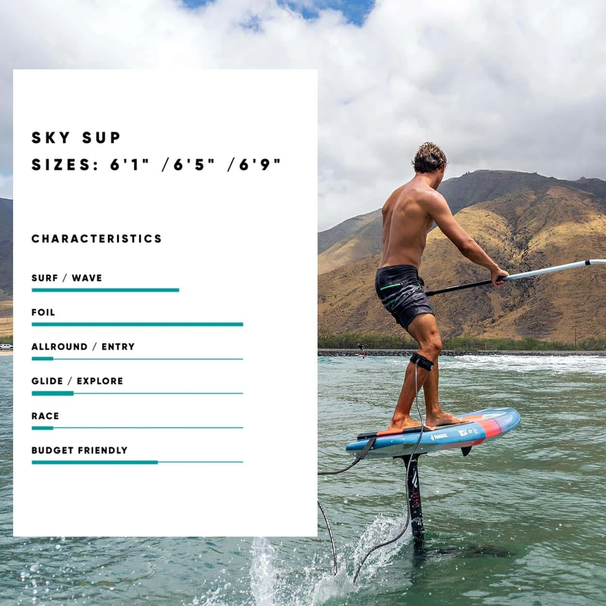The new 2023 Sky SUP is a compact SUP foil board perfect for shredding any size of waves on a foil for paddlers or surfers at any kind of level and can be used for Wing Foiling too. It’s stability and volume make it a relatively user-friendly board when paired with the recommended rider weight. Less experienced paddlers will be surprised by the ease of paddling for such a short board, while more experienced paddlers will enjoy the compact shape for pumping and higher performance maneuverability.